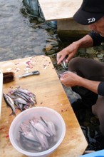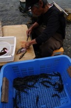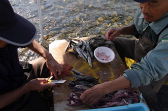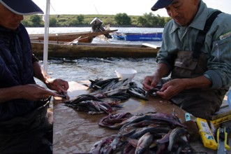 / 人,川,魚,鮎,アユ,まな板,カッター,器,カゴ,帽子,船,エンジン,堤防,植物,木,河畔植生