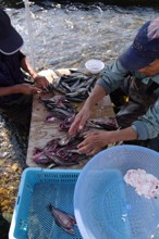 / 川,川底,岩石,カゴ,まな板,魚,桶,たわし,人,帽子,ペンチ,工具