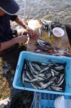 / 人,川,川底,岩石,魚,鮎,アユ,まな板,カッター,器,カゴ,帽子