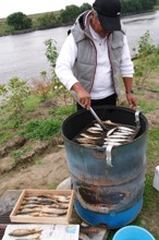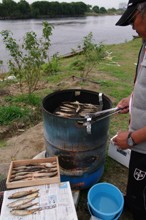 / 川,消波ブロック,植物,河畔植生,木,ドラム缶,トング,魚,アユ,鮎,人,網,眼鏡,帽子,たばこ,腕時計