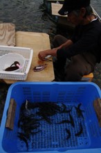/ 川,川底,岩石,カゴ,まな板,魚,桶,たわし,人,帽子